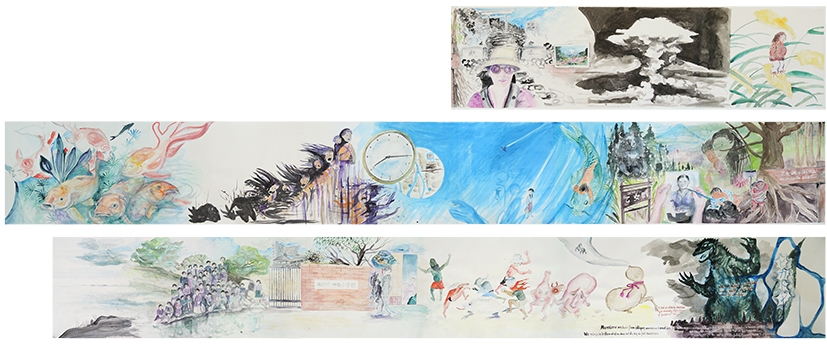 The scroll begins with a sparrow yōkai, a spirit creature that tells the story. The journey leads from the explosion, to a postcard of Mount Fuji on my dresser, and a selfie on the summit of Fuji, continuing on to the Omote Pass, which winds over the enchanted Kintoki Mountain, a mythical landscape shaped by ancient tales, such as that of the wild boy Kintarō and a giant bear.