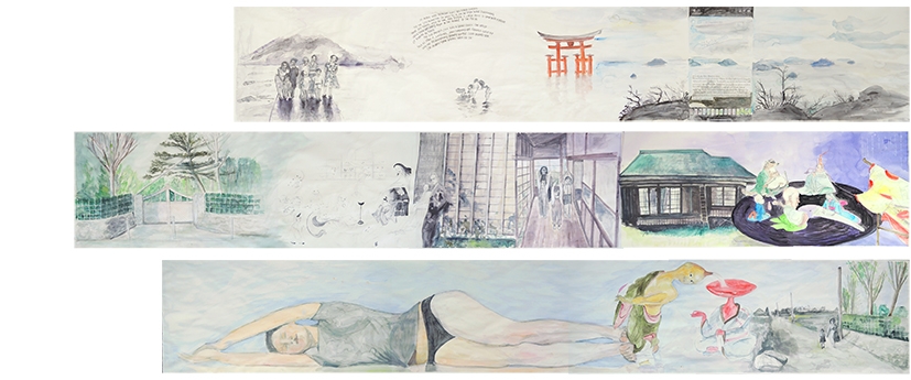 It follows the principle of emakimono, Japanese picture scrolls in which text and image merge into a continuous narrative flow.